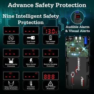 [Advance Safety Protection] Safely designed with nine intelligent protection systems: over-limit, over-crank attempt, relay connection faulty, low voltage, reverse polarity, short circuit, reverse charging, overheat, and over-voltage protections.