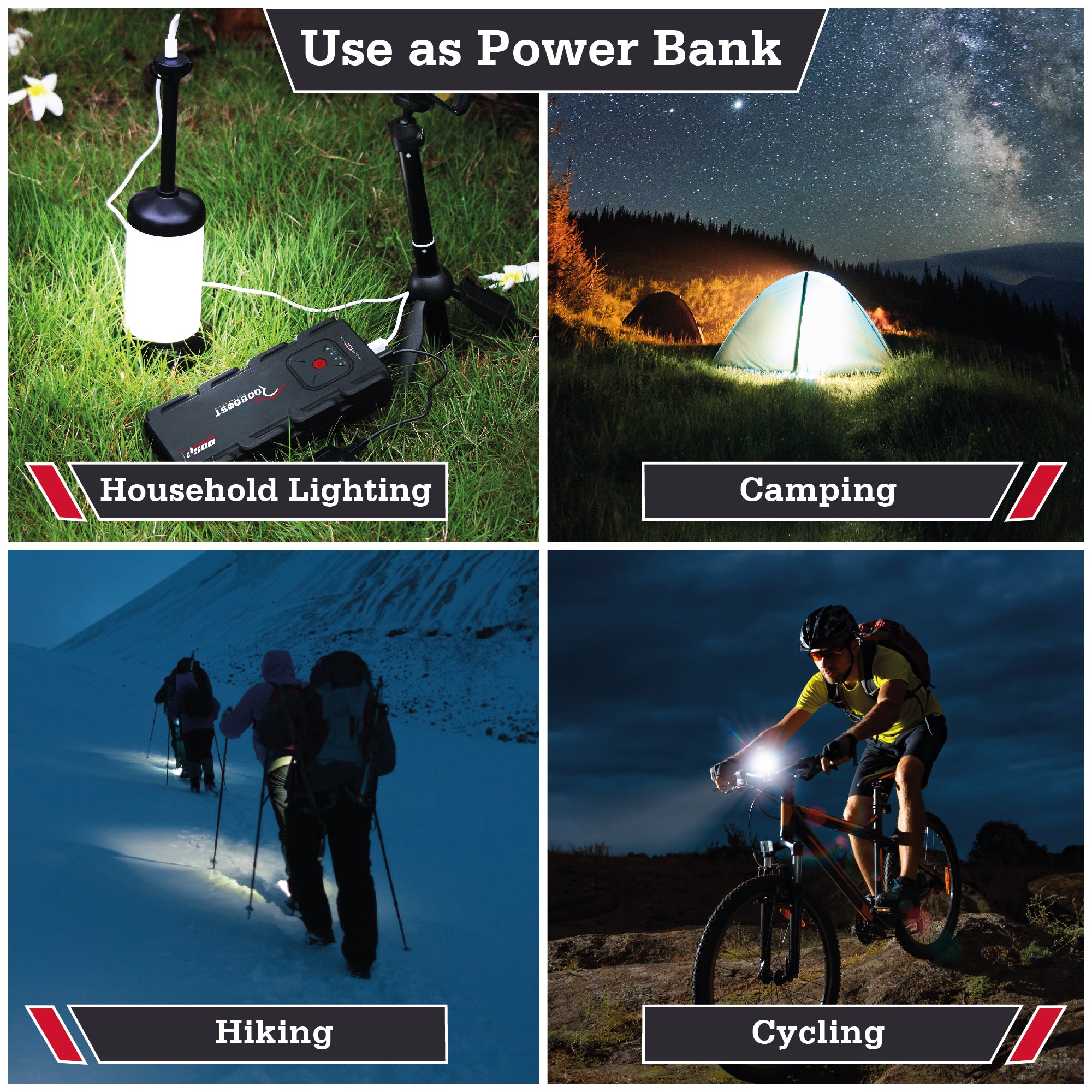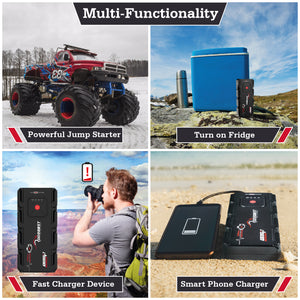 [Multi-Functionality] Vehicle jump starter, portable power bank, smartphone charger, 3-mode LED flashlight (Light/SOS/Strobe), 4 outputs (USB quick charge, extra USB port, type-C in/out fast charging, DC output 12-16.8V/10A).
