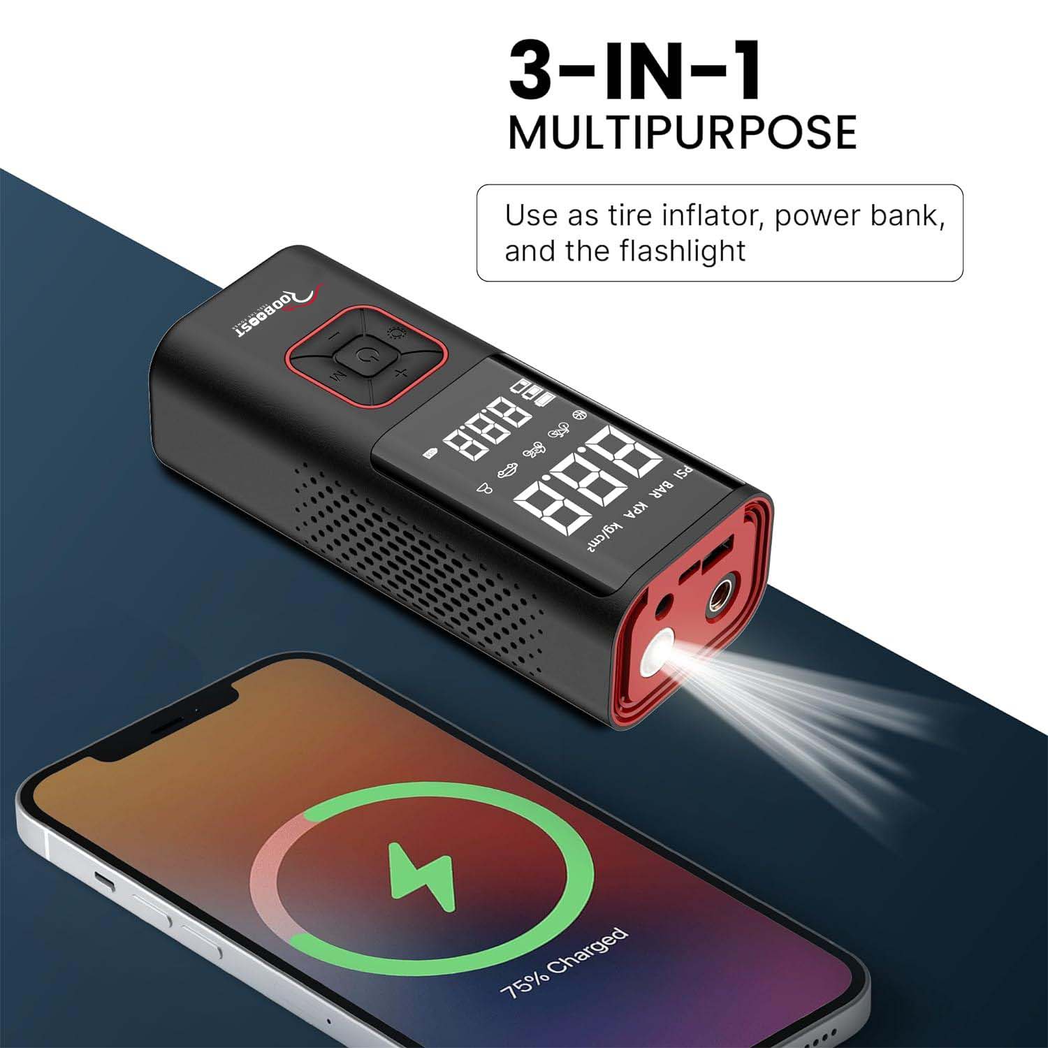- Powers the inflator and doubles as a portable power bank with USB output.